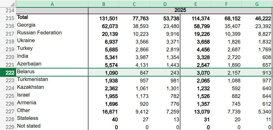 Агулам за пяць гадоў (2021-25) у Грузію прыбыло 22.890 або 22.042 беларускіх эмігранта, выехала з яе — 10.209 альбо 11.214.