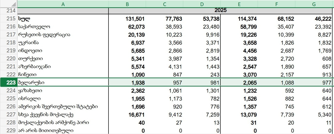 Паводле грузінамоўнай версіі табліцы, летась у Грузію прыбыло 1.938 мігрантаў з беларускім грамадзянствам (957 мужчын, 981 жанчына), выехала з яе — 2.065 (1.088, 977), або на 127 больш.