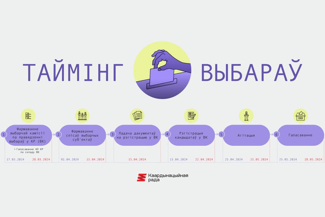 Агітацыя пройдзе з 25 красавіка па 25 траўня. На падачу і разгляд скаргаў закладзены перыяд з 29 траўня па 8 чэрвеня, у гэты ж дзень будуць абвешчаныя канчатковыя вынікі выбараў.