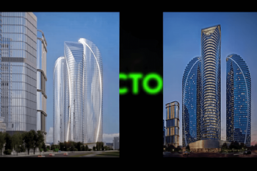 “Объект представляет собой три “башни” высотой до 50 этажей каждая в непосредственной близости друг к другу. Они будут объединены стилобатом и примыкающим торгово-административным центром <…> в границах улиц Томашевской, Тимирязева и переулка Тучинского”, — говорится в расследовании.