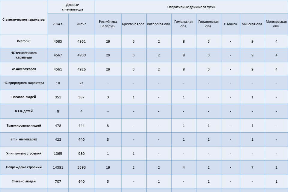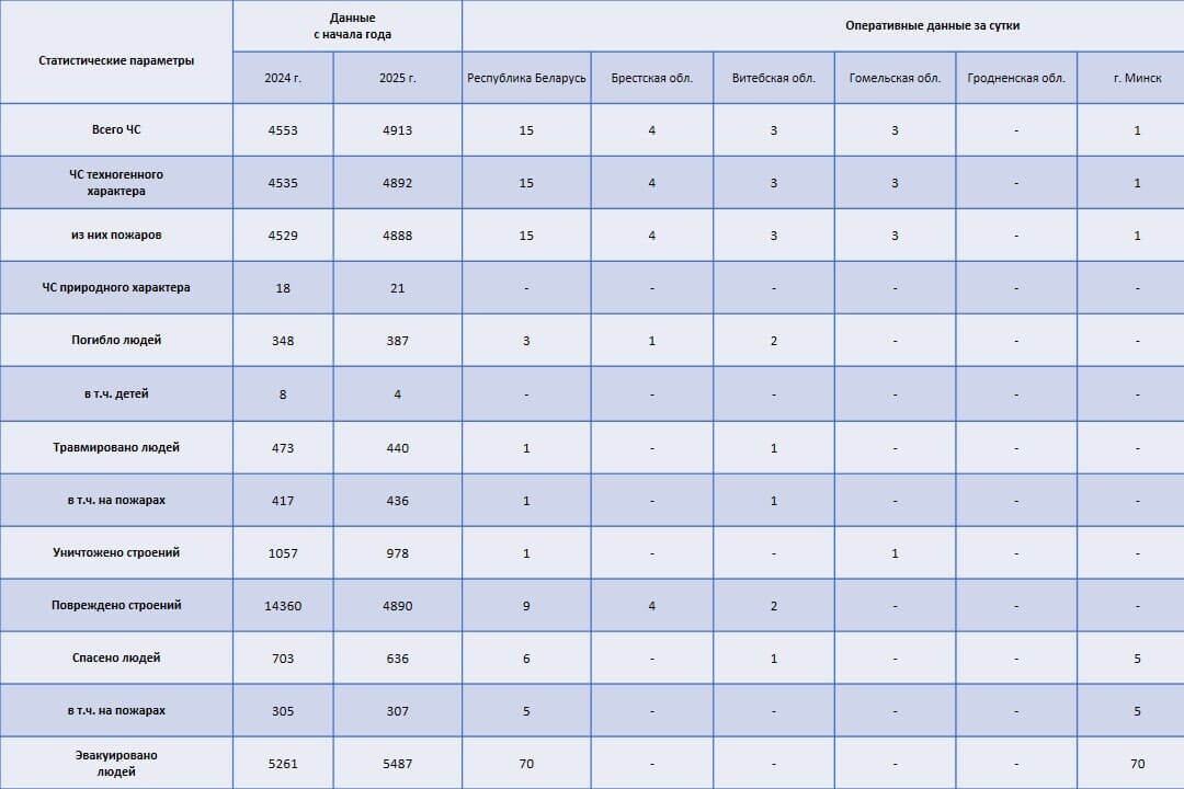 По официальным данным МЧС, в Беларуси с начала года произошло 4.926 пожаров — на 8% больше, чем на аналогичную дату 2024-го (4.561). Погибло 387 человек (351; +10,3%).
