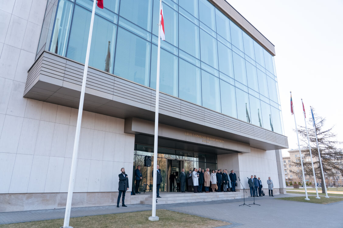 30 марта, Позірк. Церемония поднятия белорусского национального бело-красно-белого флага — “символа воли и непокоренности“ — состоялась утром 30 марта у Сейма Литвы с участием демократического лидера Светланы Тихановской.