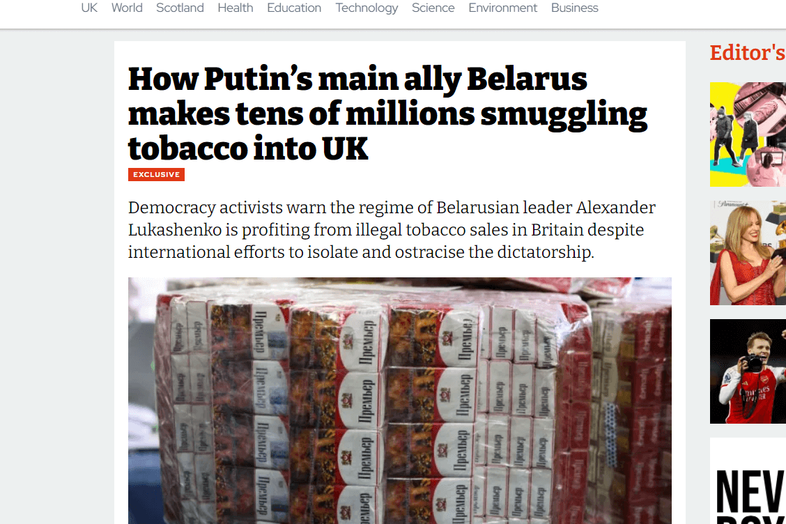 В статье британского СМИ Александр Лукашенко называется “главным союзником Путина“, утверждается, что на контрабанде табака в Великобританию он “зарабатывает десятки миллионов“.